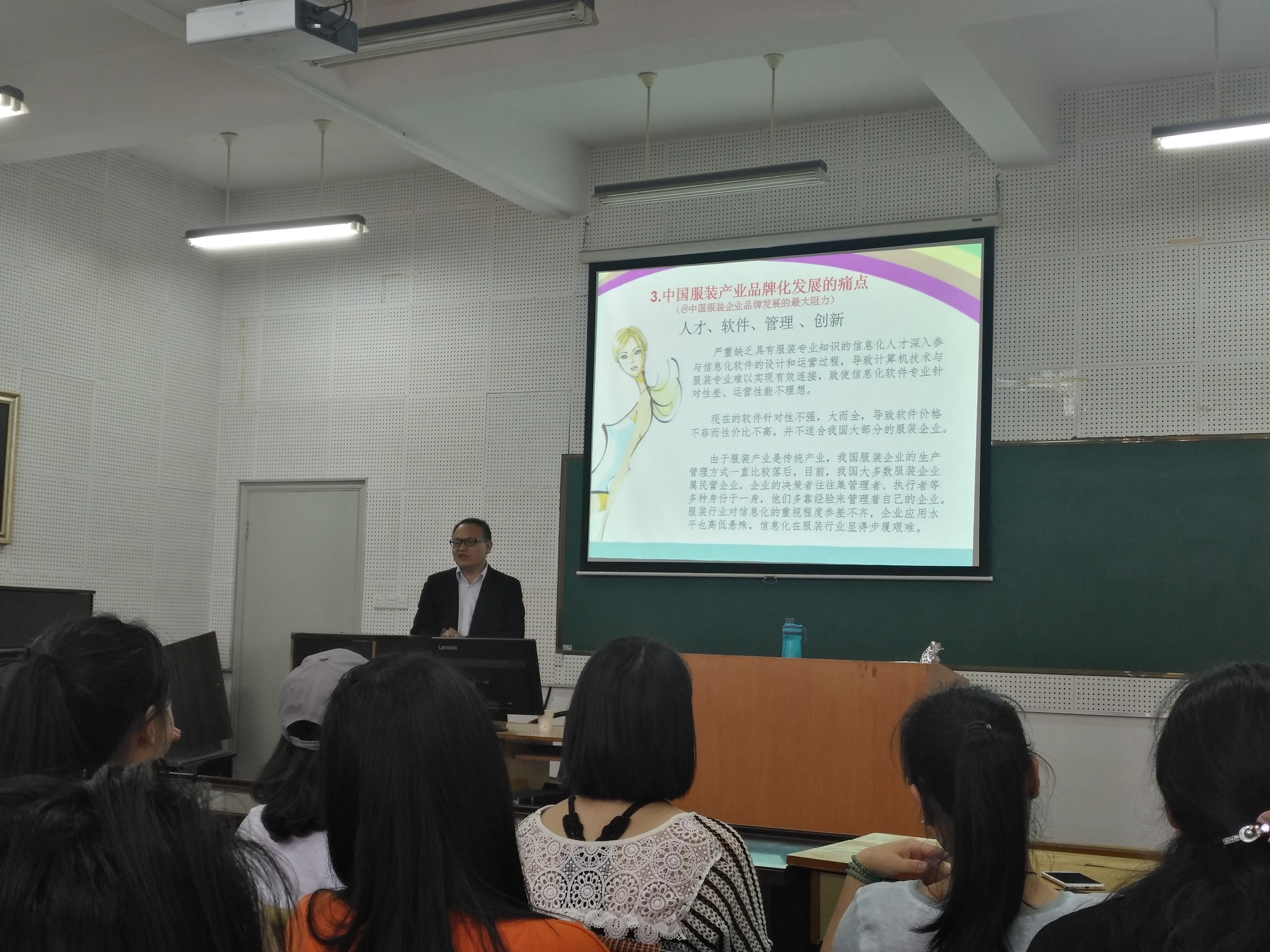 陈桂林教授从中国服装产业的格局、现状讲到中国服装产业品牌化发展的痛点,向我们展示了服装产业的更迭变化,并且重点向我们阐释了目前个性化高级服装定制和3D、4D甚至5D的发展,让在座师生经历了从头脑美学到技术美学的体验。陈教授的精彩讲座,清晰流畅,内容丰富,让大家陶醉于异彩纷呈的服装艺术世界。