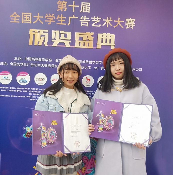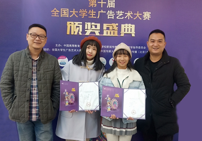 第十届全国大学生广告艺术大赛颁奖典礼11月24日在北京举行。我校艺术与设计学院视觉传达系教师秦伟、李志明指导的两件学生作品获平面类全国二等奖,获奖师生受邀到现场领奖。获奖的作品分别是2015级学生张华雅、陈晓娴作品《“善心”“善言”“善行”》, 2015级学生叶姿彤、林东海作品《娃哈哈红枣、芒果饮品包装设计》;另外还有五件作品获得全国优秀奖。这是艺术学院设计系学生迄今所获得的最高奖项。