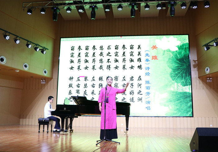 音乐会在陈菊芳老师及全体女生的《饮湖上初晴后雨》歌曲中拉开帷幕。而后,陈菊芳老师演唱《关雎》一曲。此曲优美婉转,给人带来了无限的遐想和美感。紧接着,陈菊芳师生同台献礼,演唱了《越人歌》、《黄鹤楼送孟浩然之广陵》、《杏花天影》、《知否知否》等十多首古诗词歌曲。这些歌曲清新华丽,抒情性强,从艺术审美上,体现了传统诗词与现代歌曲的完美结合。一首气势磅礴的《将进酒》,将音乐会推到了高潮;澎湃的激情,昂扬的气概,将音乐会浪漫进取的精神意蕴展现得淋漓尽致。最后,音乐会在全体同学的《赋得古原草送别》的歌声中缓缓结束。