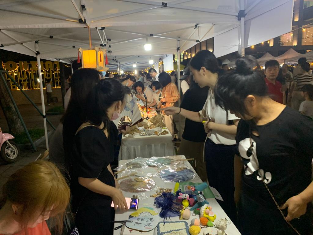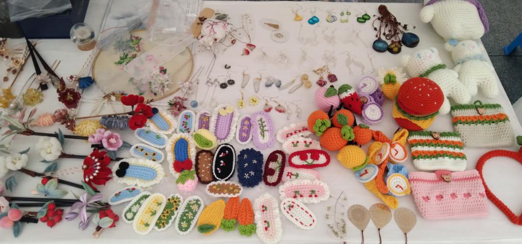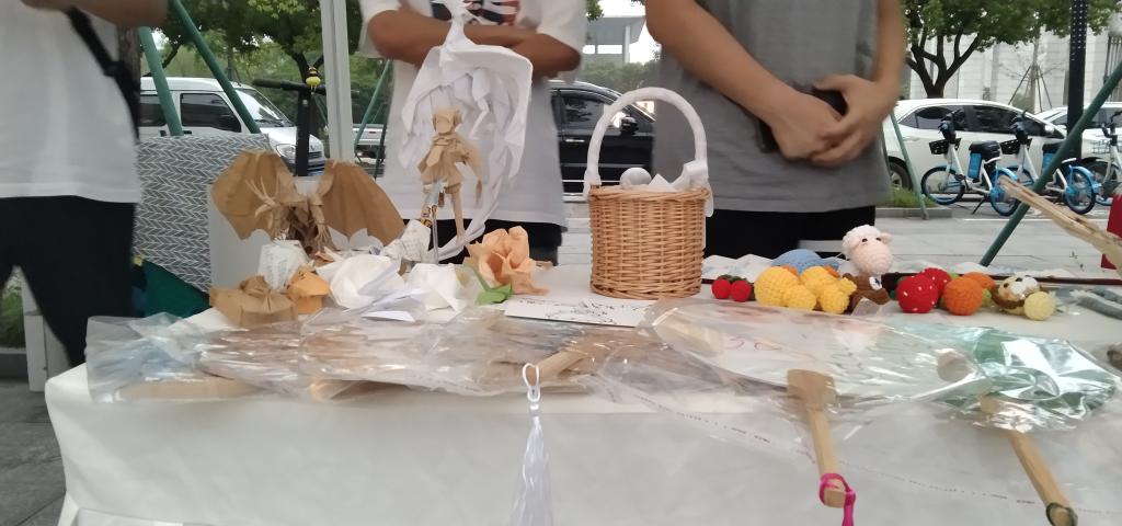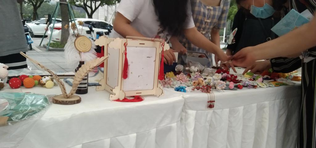 当“艺术”遇上“地摊”,当市井与文化融合,别有一番风味。此次地摊艺术节囊括台州乱弹、汉服插花秀、音乐演出、拍卖会等环节。我院学生在前期征集的基础上,筛选出质量较高的手工制作、书画、折纸、针织物、耳饰等作品参与活动。活动在主持人激情澎湃的开场白中拉开帷幕!舞台演出精彩纷呈,音乐与灯光交汇,游客络绎不绝。热闹的集市之中,时常有市民在我院学生摊位驻足欣赏。学生在售卖过程中时刻保持微笑,耐心解答市民疑问,服务热情,讲解到位。部分市民对书画鉴赏兴趣浓厚,与我院学生聊得津津有味,时长半小时有余。此次售卖活动共计获得1千多元,参与的学生表示在摆摊过程中受益良多。