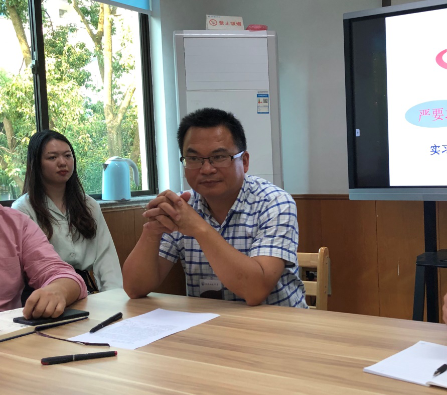 实习带队教师李俊副教授也作了发言。他除了再次对实习学校、校领导以及指导老师表示衷心的感谢之外,还特别强调了实习同学不仅要遵守台州学院的规章制度,更要遵守实习学校的校纪校规。同时表示尽职尽责为同学们的实习做好后勤保障工作,做好与双方学校的交流沟通工作,深入了解关心实习生在实习中遇到的各种问题,并有效解决。