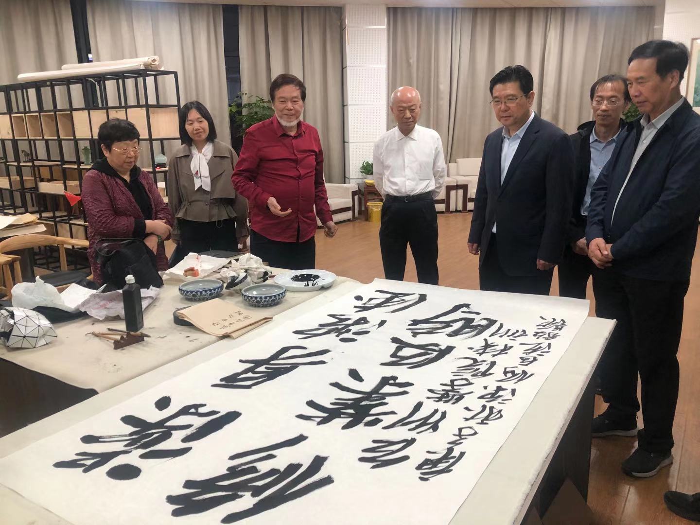 何水法先生一行先是饶有兴趣地参观了国家级非物质文化遗产仙居无骨花灯和张秀娟的剪纸艺术,然后到音乐厅演唱歌曲,现场体验音乐厅的舞台效果。在书画研修室,客人们与校领导进行了热情友好的交谈,何水法先生还即兴为学校题写了“澡身浴德,修业及时”八个大字,笔法行云流水,苍劲有力,充分肯定了艺术与设计学院的教学理念与发展方向。