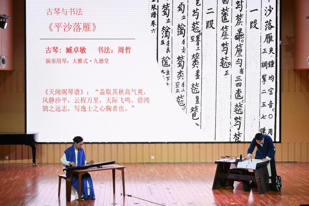 音乐会在臧卓敏博士和其学生古琴合奏的《酒狂》一曲中拉开了帷幕,流畅而富有激情的琴声将那醉酒朦胧的情态,古代文人愤世嫉俗的不平之气展示得淋漓尽致。第二首《平沙落雁》瞬间点燃现场气氛,周哲、臧卓敏的古琴与书法将古代艺人的优雅生活生动再现,让我们感受到古代文人的闲情雅致。接着,一首古琴与钢琴合作的《不染》则带来了中西合璧的奇妙感受。而臧卓敏的一首古琴独奏《广陵散》更是将全场气氛推至高潮,此曲旋律慷慨激昂,气势空灵奔放。最后,音乐会在臧卓敏、王海音和陈菊芳的古琴洞箫合奏《阳关三叠》中落下帷幕。