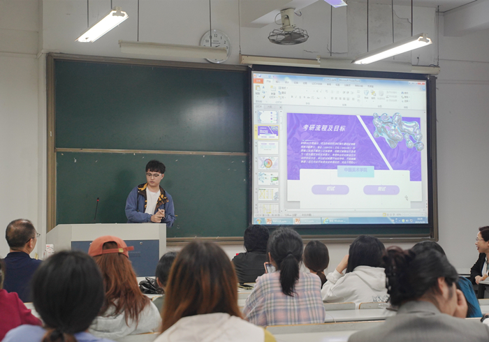 近日,艺术与设计学院在3号教学楼3-202教室举办美术学专业考研分享会,毕业后依旧坚持厚积薄发最终取得研究生入学资格的2016级美术学(师范)专业学生李军、2017级美术学(师范)专业学生代表范智超、徐锦敏、龚晨及徐心卉应邀作考研经验交流,学院副书记林军辉,美术系主任王斐玲、教师陈继军及40多名有考研意向的同学参加交流会。
