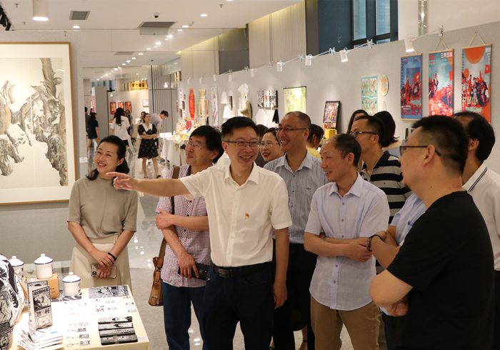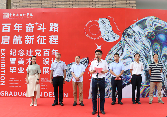 6月10日上午,艺术与设计学院在艺术楼广场举办了“百年奋斗路·起航新征程”——庆祝建党百年暨美术、视觉传达设计专业学生毕业作品展开幕式。台州学院党委委员、宣传部部长金松、台州市委宣传部文艺处处长尚小星、艺术与设计学院党政班子成员及美术、设计专业部分师生参加开幕式。