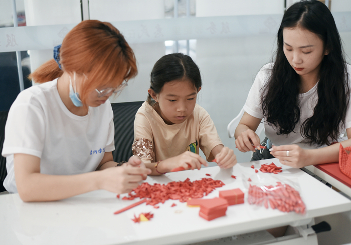 据介绍,该活动团队学生们立足专业特色,整合优势资源,围绕"红色精神纸上现"主题,采用剪纸、衍纸、折纸、手工钩针、布艺等艺术形式,教授社区居民制作三角插红船、衍纸中国地图、建党百年剪纸、手工口金包等红色手工产品。