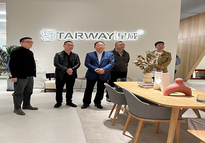 会前,柯胜海参观了星威国际家居有限公司展厅,公司设计部部长余辉先生就星威如何打造国际知名品牌进行了详尽的介绍,介绍不同椅子的材质、工艺和企业的发展情况。