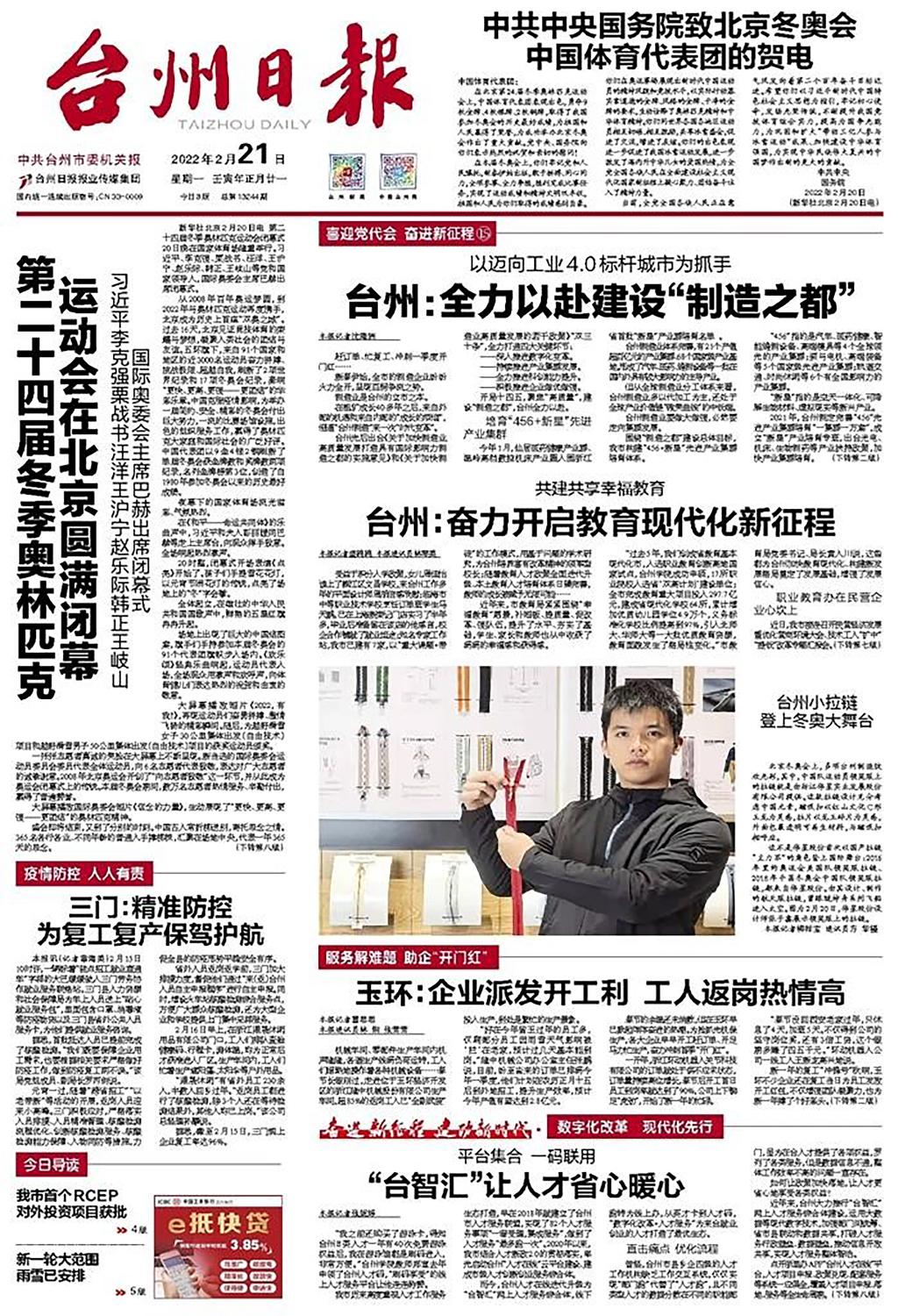 北京冬奥会上,中国运动员领奖服上的拉链是由浙江伟星实业发展股份有限公司提供。此作品的设计师张子鑫正是台州学院艺术与设计学院2020届产品设计专业毕业生。这款拉链设计充分考虑中国元素,磁吸扣上以有“中华第一玉龙”之称的红山文化C形玉龙为灵感来源,造型流畅古朴,颇具国风美感。拉片采用龙玉碎片为灵感,外面包裹透明可再生材料,与磁吸扣遥相呼应。