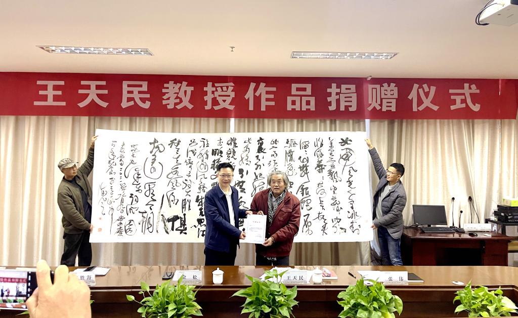 金松部长代表学校给王天民教授颁发捐赠证书,并指出,王天民教授的作品内容融入了台州的文化积淀,体现出了“吾心安处是吾乡”的情感意蕴;王天民教授在创作方面的激情和对书画艺术执着追求,值得每一位同志学习;对于王教授的捐赠,学校表示衷心的感谢。