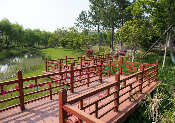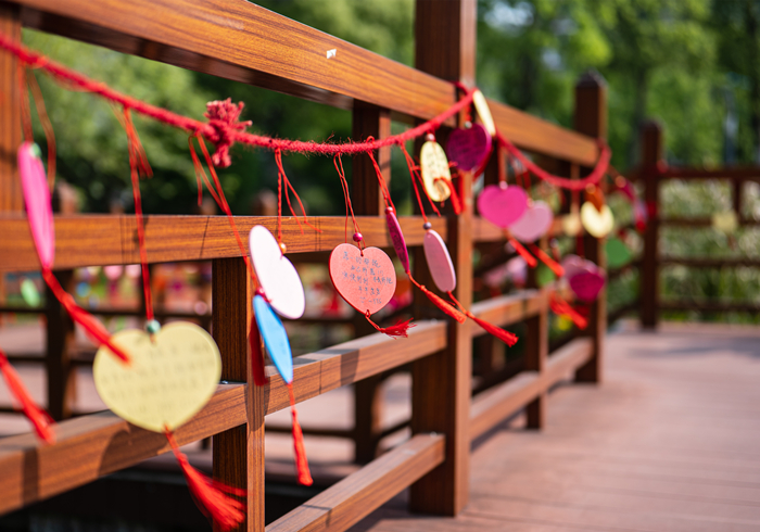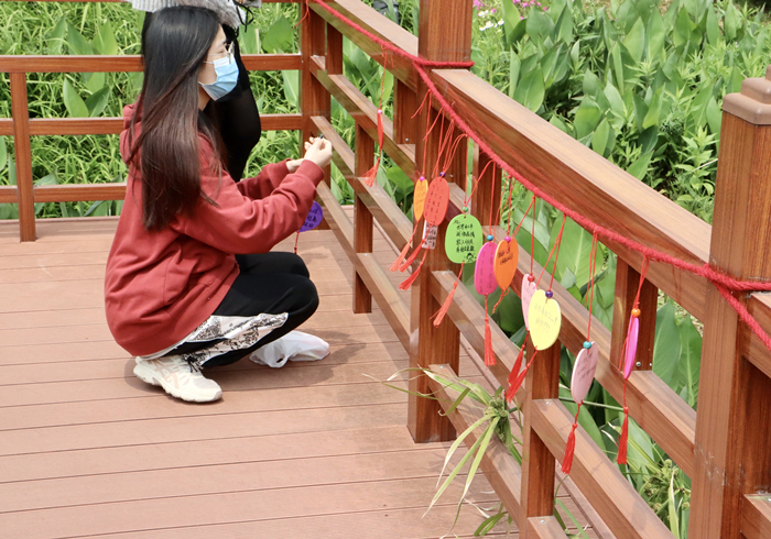 心愿桥位于心湖的九曲桥,是台州学院一道亮丽的校园文化景观,木质纹理,古朴厚重,志愿者们牵起红绳围在红木桩上,再将心愿牌一一系在红绳上,微风拂过是清脆的砰砰声,是流苏交缠的模样。牌子上满满都是““愿台州学院早日升格,愿艺术与设计学院早日申硕”“愿早日解封,病毒退散”“愿前程似锦,学途坦荡”的话语,心愿桥见证着同学们的心愿和梦想,祈福之礼古来有之,这份美好定会成真。