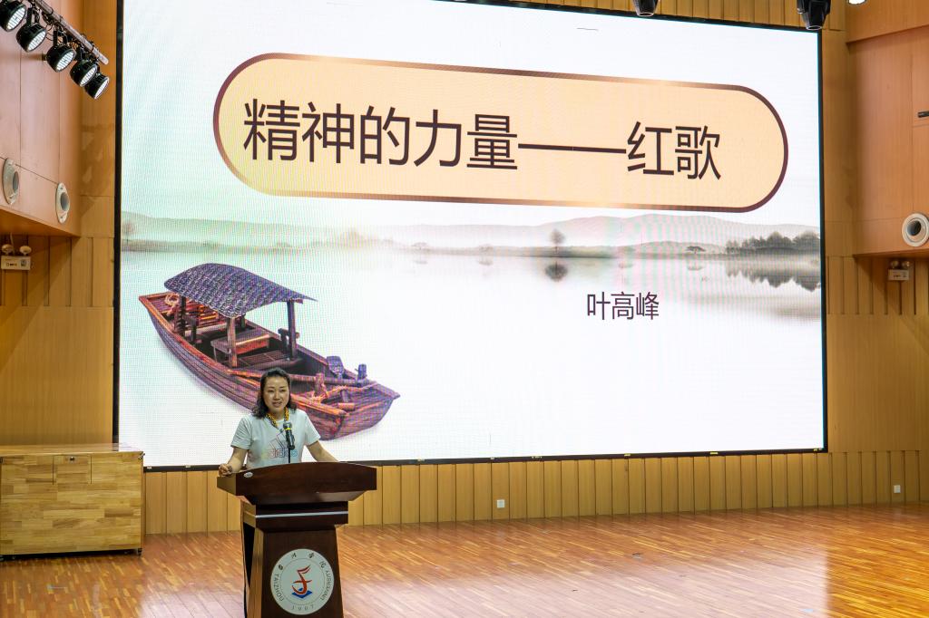 6月9日下午,艺术学院音乐厅,时而传来悦耳动听的歌声,时而传来抑扬顿挫的讲课声,现场掌声此起彼伏,很难想象,这里正在举行一场党课。学院副院长叶高峰结合自己的专业,以“精神的力量—红歌”为主题,为全院教师展示了一堂充满艺术风的党课。