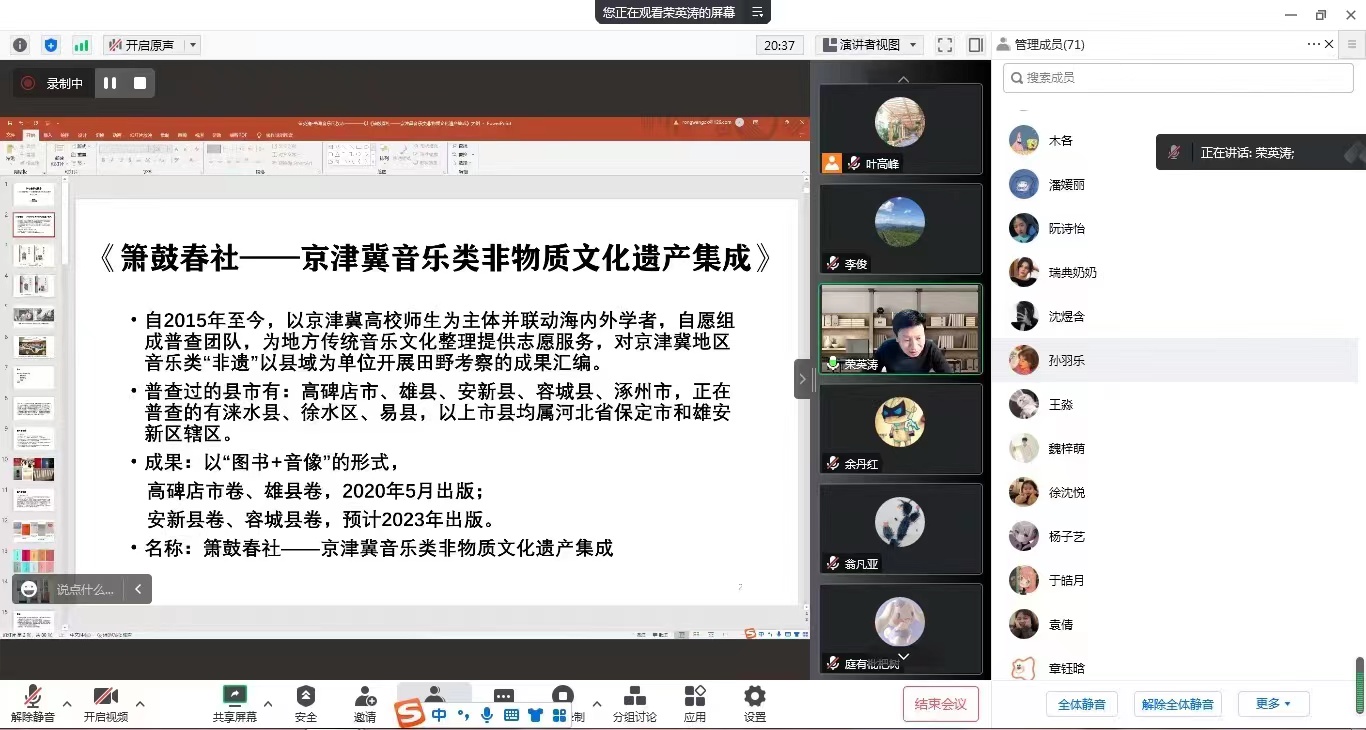 荣英涛博士在《书写民族音乐志——以雄安新区音乐类“非遗”田野考察为例》讲座中,详细介绍了2015年以来,以京津冀高校师生为主体并联动海内外学者自愿组成考察团队,为地方传统音乐文化整理提供志愿服务,对京津冀地区音乐类“非遗”项目以县域为单位开展田野考察的成果汇编。讲座以图文并茂的形式回溯与反思了这一工作中的诸多重要经验和创新性工作方法。