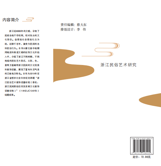 浙江近6000年的文明,孕育了民间各地不尽相同、相对独立的文化圈。由原始社会巫傩礼仪为始,延续千百年,演变为民间的各种民俗行为,浙江民俗艺术既多元又独立,体现的,是人类的文化积淀和积极向上的精神风貌,地域特点鲜明、质朴、清醒、健朗,有着旺盛的原生态的活力,张维纳老师在研究期间,一直保持一双好奇的眼睛,去发现、探索和思考,在这过程中披荆斩棘,从视觉角度出发,淬炼出浙江本土的、特有的文化根脉。本书以平实的语言,对浙江各地不同风貌的民俗艺术形式追根溯源,从新石器中晚期河姆渡和良渚文明的纹饰文化开始入手,探究各类不同的民俗现象和艺术形式,研究领域宽广,从山区到平原,再到海岛滩涂,民众的衣、食、住、行等各种民风习俗,都通过图像、图形、色彩符号等概括和提炼,归纳成脉络清晰的民俗艺术体系,从形、色、意等方面阐释浙江民间的文化现象和装饰语言,展现了富有生活气息的江南地方特色。具有历时和共时的特性,为浙江民俗艺术的研究、传承和发展提供了理论支持。我们相信,浙江的民俗艺术,正如盛开在本乡本土泥土中的绮丽花朵,历经冬夏,留下的,是永恒的风景。