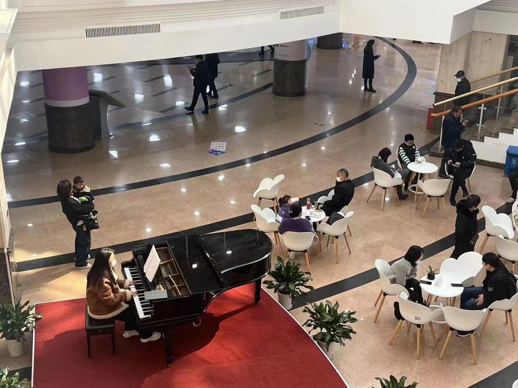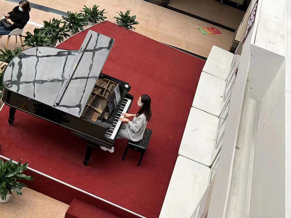 此时,这里正在举行一场特殊的钢琴“音乐会”。演奏者是来自台州学院艺术与设计学院的大学生们,丁晶玲是此次活动的带队教师,她介绍,“弹奏活动于2021年开始,是由台州学院艺术与设计学院和市中心医院共同发起的,旨在用音乐的力量,给予患者心灵的抚慰,为大家营造温馨舒适的就医环境。活动期间,同学们利用课余时间,利用专业所学积极开展演奏,一直坚持到现在,累计演奏500余次,近23000分钟。收到了患者和院方的一致好评。”