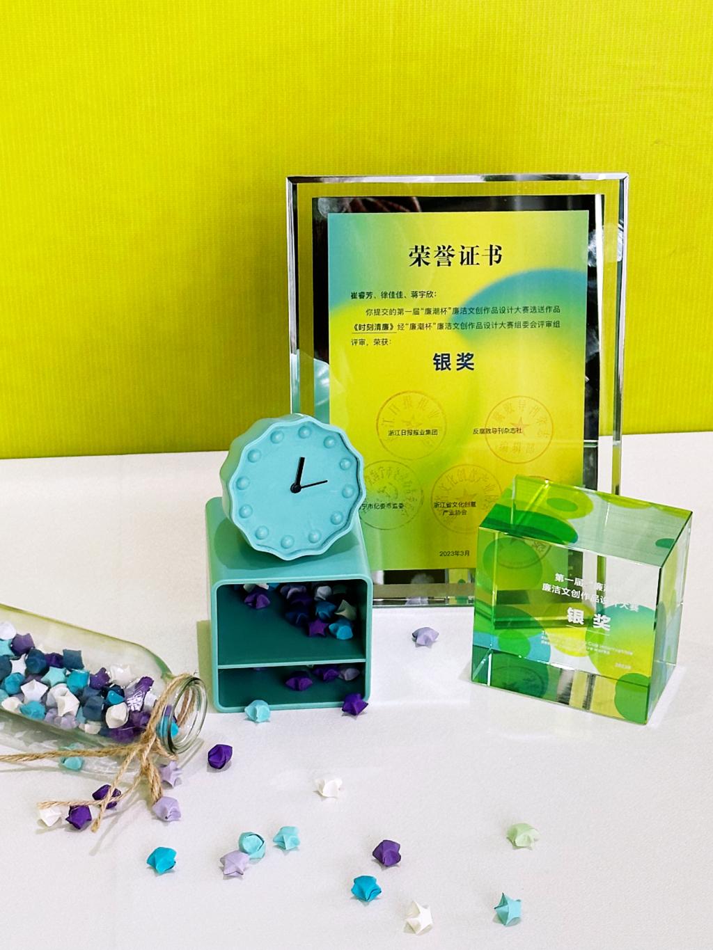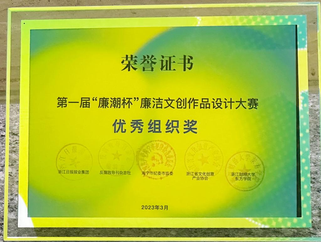 3月17日下午,浙江省首届“廉潮杯”廉洁文创作品设计大赛颁奖仪式及优秀作品展在浙江财经大学东方学院举行,艺术与设计学院学生崔睿芳、徐佳佳、蒋宇欣荣获大赛银奖。台州学院荣获优秀组织奖。