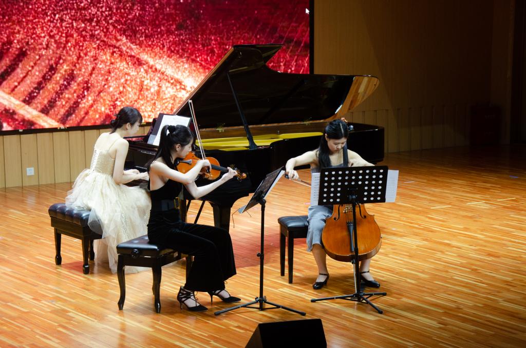 随着于子伊演奏的弗朗兹·舒伯特《钢琴奏鸣曲降B大调D.960》,音乐会拉开帷幕。交错的黑白键孕育出温暖平和的乐声,曲子采用温暖如春的降B大调铺设基调,第一乐章平和恬静,犹如一卷田园诗画;第二乐章慢板采用葬礼进行曲风格,中间穿插的大调部分如同对过去美好过往的追忆,让人沉醉其中。亨利·杜蒂耶的《三首为钢琴而作的前奏曲》以左右手追赶为灵感和主题,多方位体现于子伊高超的技巧和对钢琴的把控。于子伊演奏的约翰·塞巴斯帝安·巴赫《D大调托卡塔BWV 912》如午后阳光,沿着古老而优雅的弧线缓缓流淌,精巧绝伦。安东·阿连斯基《D调三重奏op.32》由大提琴演奏者旧金山音乐学院研究生顾维安、小提琴演奏者伊斯曼音乐学院研究生柯筱曼和于子伊共同演奏,伴随优美的旋律,音乐会也走向尾声。