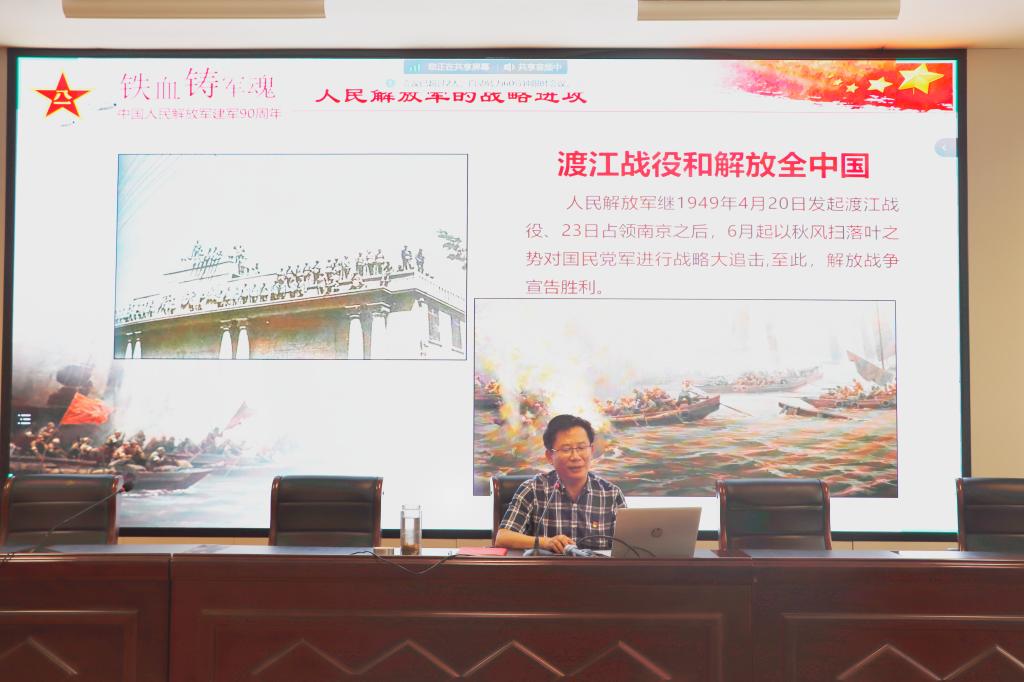 姜向阳以“铁血铸军魂”为主题,强调师生党员们要学军史、知传统,加强铸军魂意识。分时期介绍了中国共产党的历史发展,阐述了中国共产党如何一步一步走向改革强军与中国特色强军之路。姜向阳表示国防和军队建设是中国特色社会主义事业总体布局的重要组成部分,这决定了强军战略是强国战略的重要组成部分。强军梦不仅是中国梦的内在组成,也是其坚强支撑。全体党员们要不忘历史,砥砺前行。