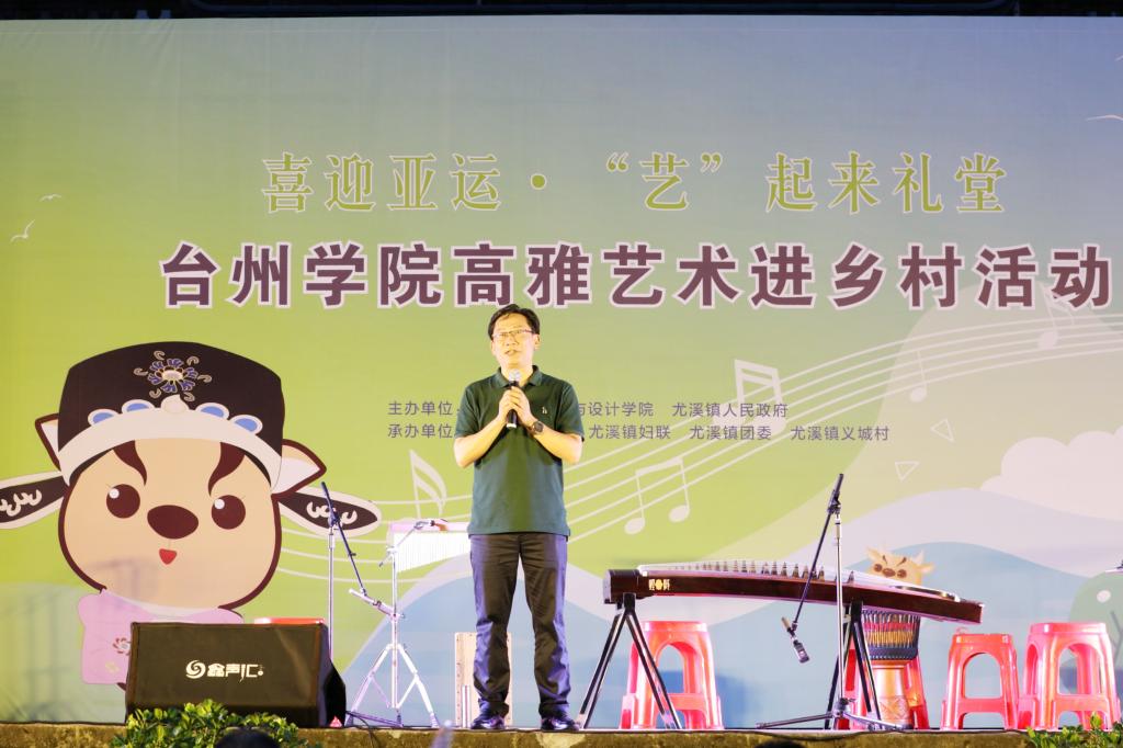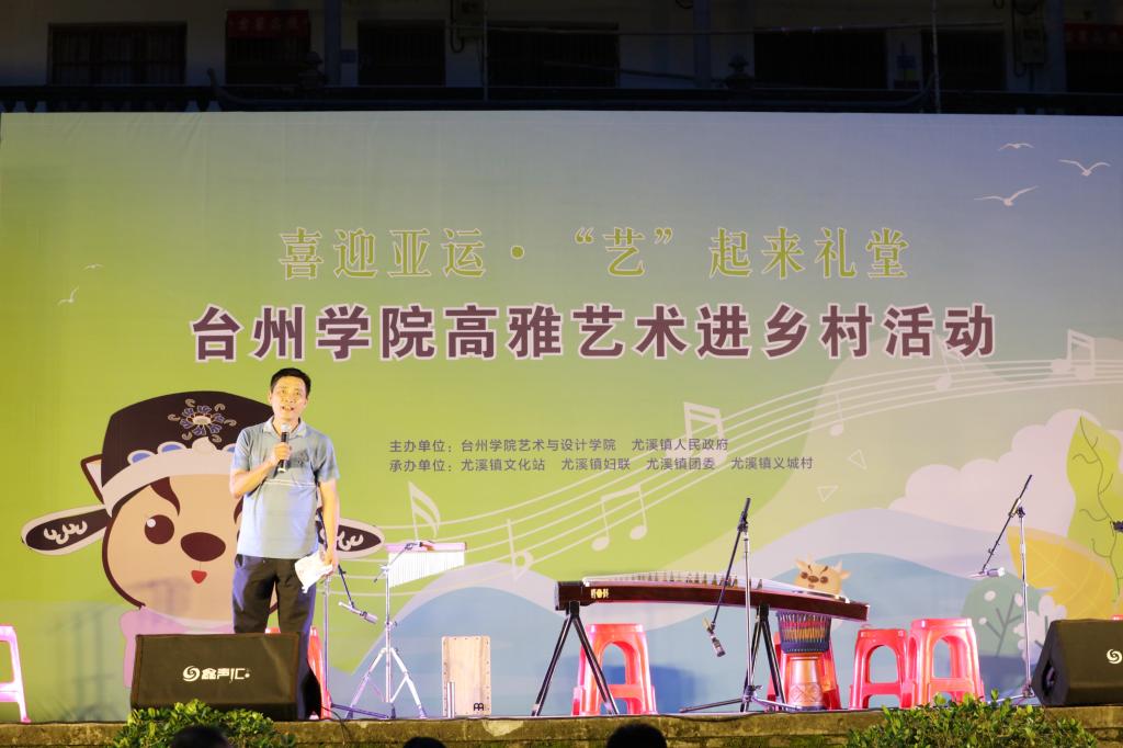 “伟大的中国共产党,风华正茂,山高水长,昂首立在新时代的征程上……”6月30日晚,尤溪镇义城村幽静的山谷里灯火璀璨、人声鼎沸。台州学院艺术与设计学院和尤溪镇人民政府携手举办的“迎亚运·“艺”起来礼堂”——台州学院高雅艺术进乡村活动正在这个小山村里举行,吸引了远近村民前来观看,乡亲们和师生们一起挤满了简单却不失庄重的露天戏台,共同庆祝中国共产党成立102周年。尤溪镇党委副书记朱永康、党委委员金苗苗、台州学院艺术与设计学院党委书记姜向阳、副院长赵振华、党委副书记王洁茹、人文学院党委副书记林军辉、艺术与设计学院地方合作办主任林海、尤溪镇义城村党总支书记金龙飞出席。