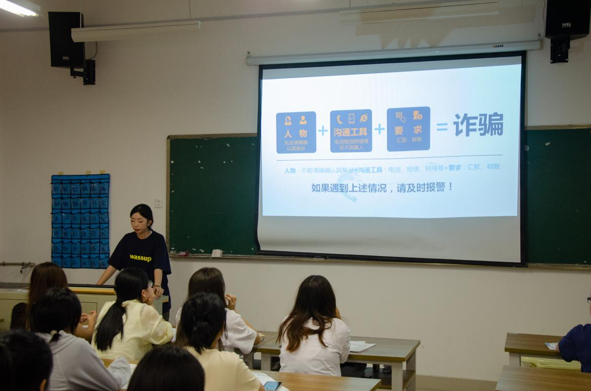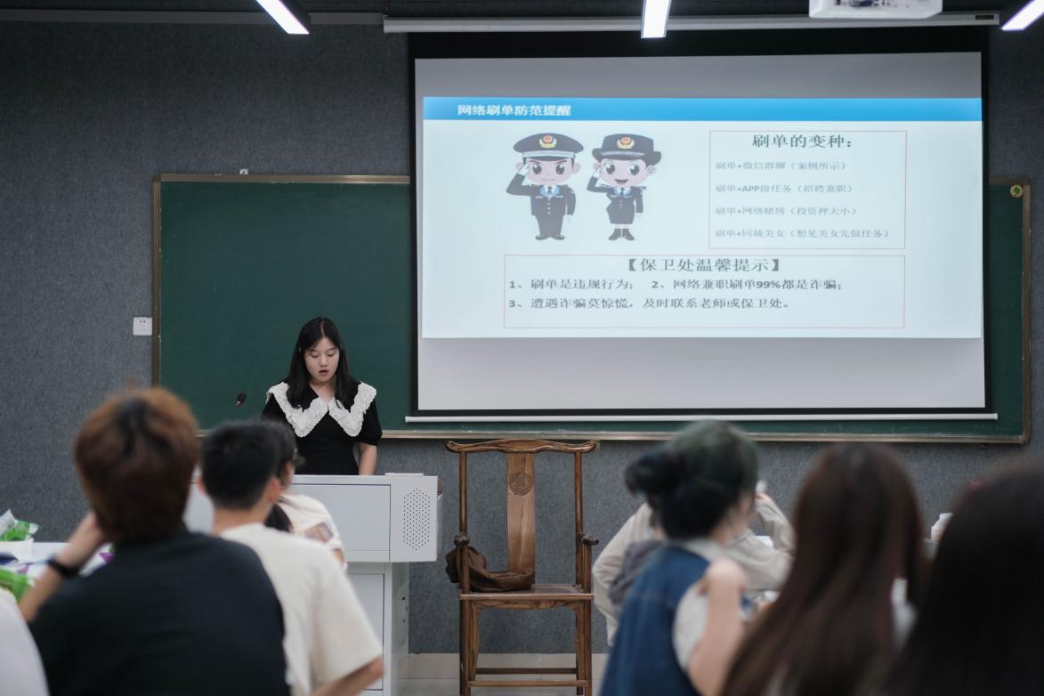 随后,班助从防范诈骗、防范盗抢、人身安全、政治安全四个方面进行安全知识宣讲,进一步提高了新生对安全风险的认识及防范能力。