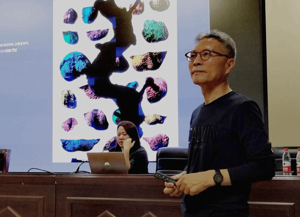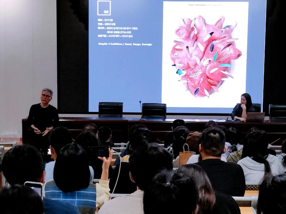 10月25日晚,韩国南首尔大学宣炳一教授在艺术与设计学院学术报告厅开设讲座“宣炳一的图形语言——图像·信息·叙事”。视觉传达设计系秦伟主任、牟建副主任以及视觉传达设计系师生到场听讲。