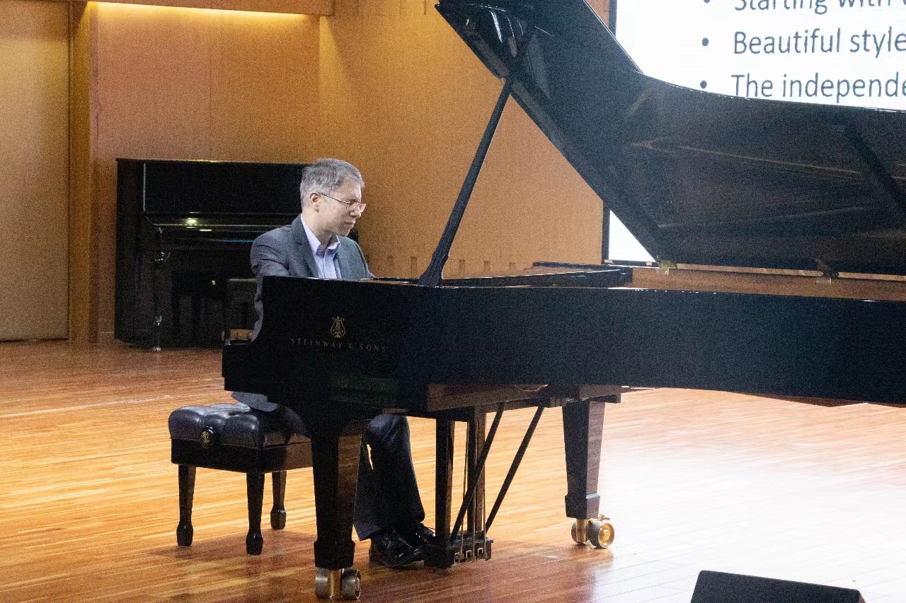 在讲座中,克维亚特科夫斯基教授以国际视角对钢琴教学与钢琴技巧进行了深入剖析。他先以肖邦生平及其相关创作特征为切入点,探讨了在浪漫主义背景下肖邦对于钢琴独奏作品曲目库的拓展与挖掘,强调其对钢琴演奏技术全面提升而做出的尝试,如连奏(legato)、断奏(staccato)等。他在现场为全体师生连续演奏了三首肖邦的钢琴作品,其中包括升C小调夜曲op.27,no.1、A小调马祖卡op.17,no.4以及降A大调波罗乃兹舞曲op.53。