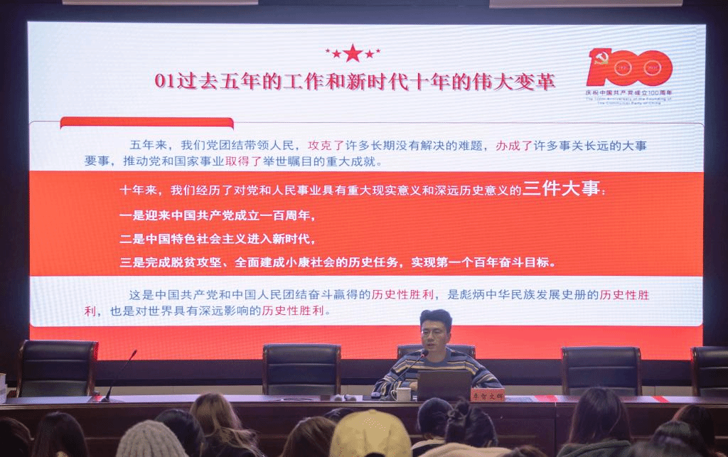 李智文辉以“党的二十大精神要点解读”为题,从大会主题和内容两方面进行深度讲解,从过去五年工作和新时代十年的伟大变革、马克思主义中国化时代化新境界、党的使命任务等15个要点详细解读党的二十大精神。他点明了当代中国青年要自强自信、守正创新、踔厉奋发、勇毅前行,要紧紧的将自身与民族、国家捆绑在一起,树立荣辱与共的意识。