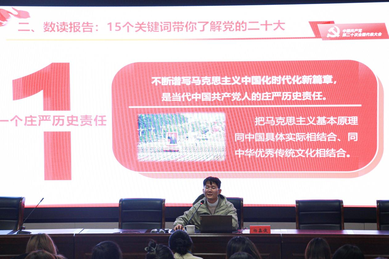 杨鑫俊以“高举中国特色社会主义伟大旗帜,全面推进中华民族伟大复兴”为主题,用15个关键词带领入党积极分子熟悉党的二十大精神,同时展示了00后排长席韬淇的志愿赴边献身的发言和申请书,为入党积极分子树立了强有力的榜样作用。他强调广大青年要坚定不移的听党话、跟党走,树立有理想、敢担当、能吃苦、肯奋斗的青年形象,要对党忠诚、不负人民的伟大建党精神。