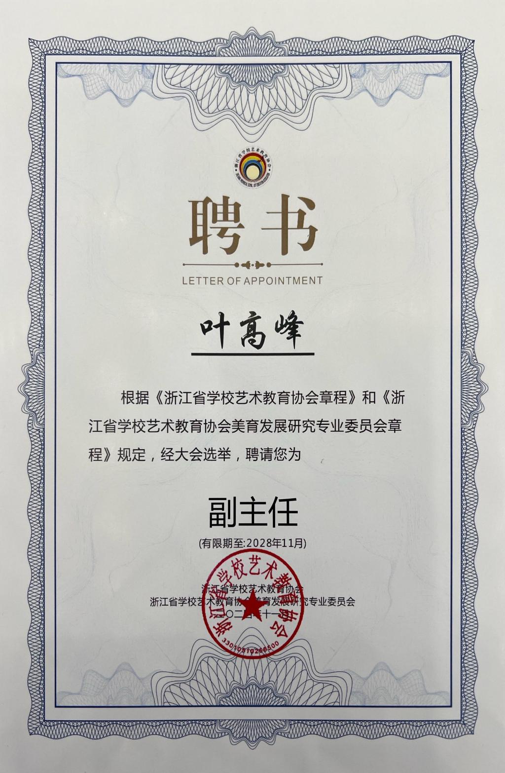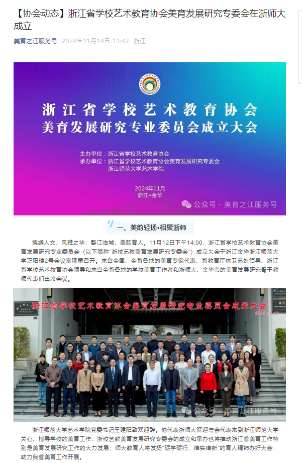 近日,据美育之江媒体报道,浙江省学校艺术教育协会美育发展研究专业委员会(以下简称“专委会”)于11月12日下午,在浙江师范大学正式成立。艺术与设计学院院叶高峰副院长被选举为专委会副主任,任期四年。