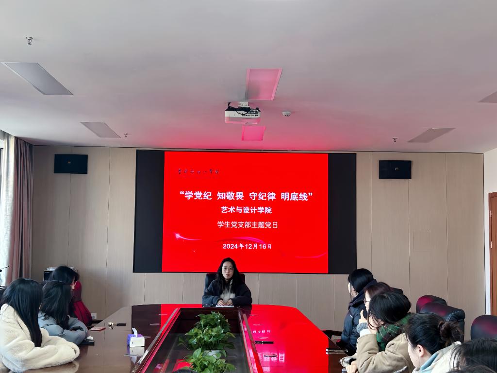 2024年12月16日,艺术与设计学院学生党支部以 “学党纪 知敬畏 守纪律 明底线” 为主题开展党日活动,旨在培养学生党员的廉政意识,营造风清气正的良好校园生态。