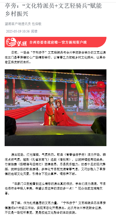 “这次活动是由我们‘宁和赤子’文艺轻骑兵和台州学院联合举办的,不仅丰富了亭旁镇村民精神文化生活,也搭建了高校与乡村文化交流的平台,推动青年学子深入基层、服务社会,同时推动校地合作,形成了‘文艺赋能乡村、青春反哺社会’的良性循环。”亭旁镇文化员林景琦说。