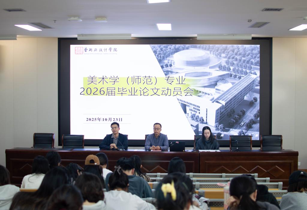 新程已启,共绘新篇!10月23日,艺术与设计学院召开2026届美术(师范)专业毕业论文动员大会暨师生见面会。学院副院长赵振华、美术系主任徐海军、副主任陈林与全体毕业生及论文导师齐聚一堂,在这场关于艺术探索与学术传承的活动中,为学子们的新阶段赋予灵感与展望。