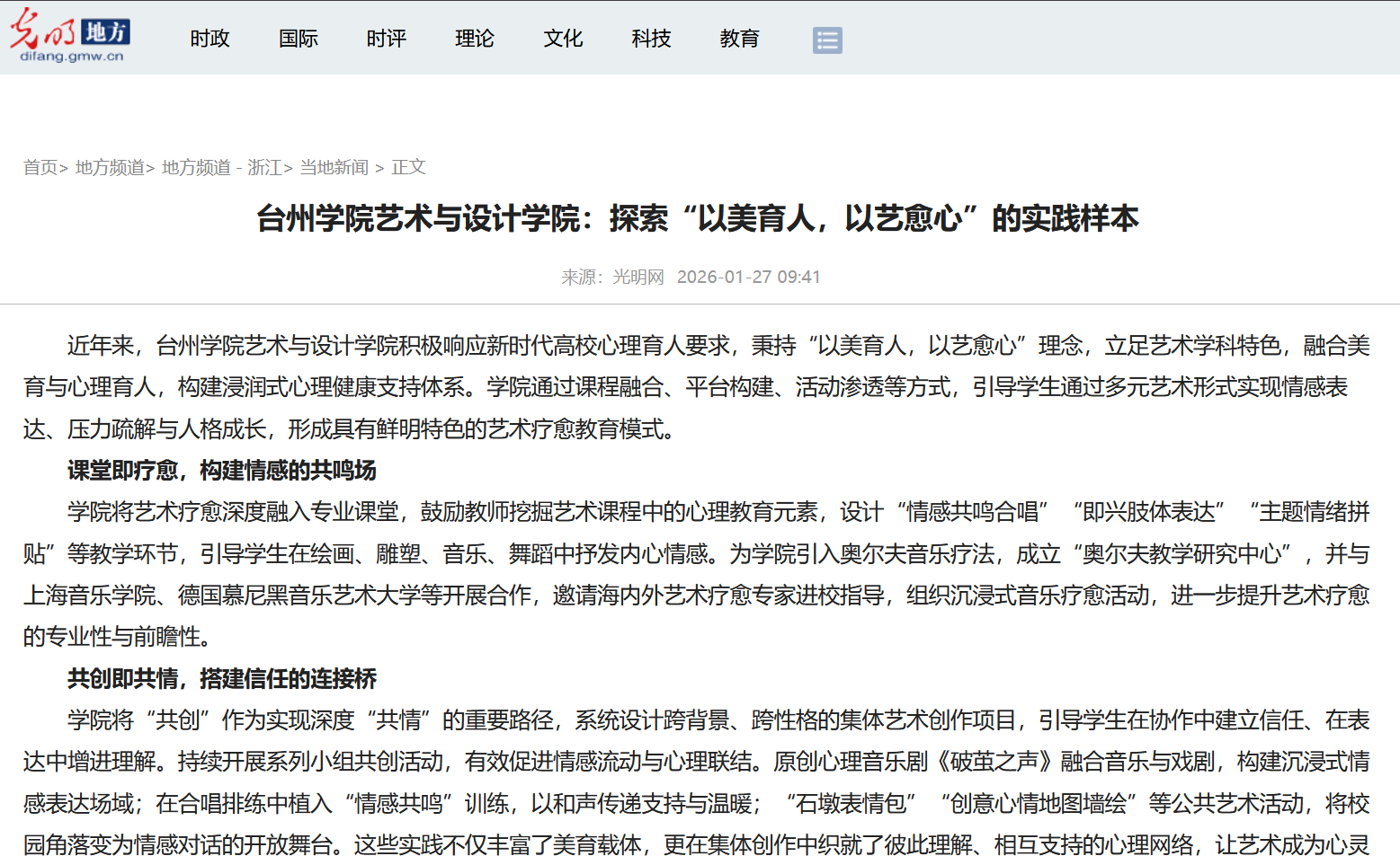 近年来,台州学院艺术与设计学院积极响应新时代高校心理育人要求,秉持“以美育人,以艺愈心”理念,立足艺术学科特色,融合美育与心理育人,构建浸润式心理健康支持体系。学院通过课程融合、平台构建、活动渗透等方式,引导学生通过多元艺术形式实现情感表达、压力疏解与人格成长,形成具有鲜明特色的艺术疗愈教育模式。