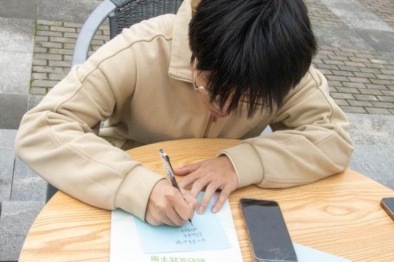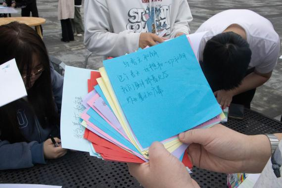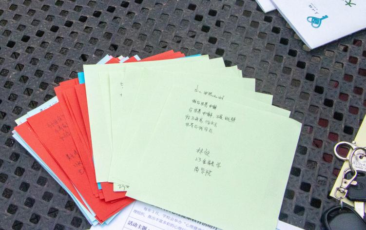 4月25日下午,“诗风翠墨,三行笔兴”心理月活动在至善广场展开,我们为参与者分发了彩色卡纸,以“我正在与xx和解” 为主题创作三行微型诗歌,吸引了不少同学踊跃报名。