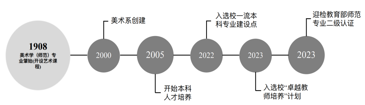 美术学(师范)专业从2005年开始进行本科专业招生,2022年入选校一流本科专业,2023年顺利通过教育部二级师范认证。